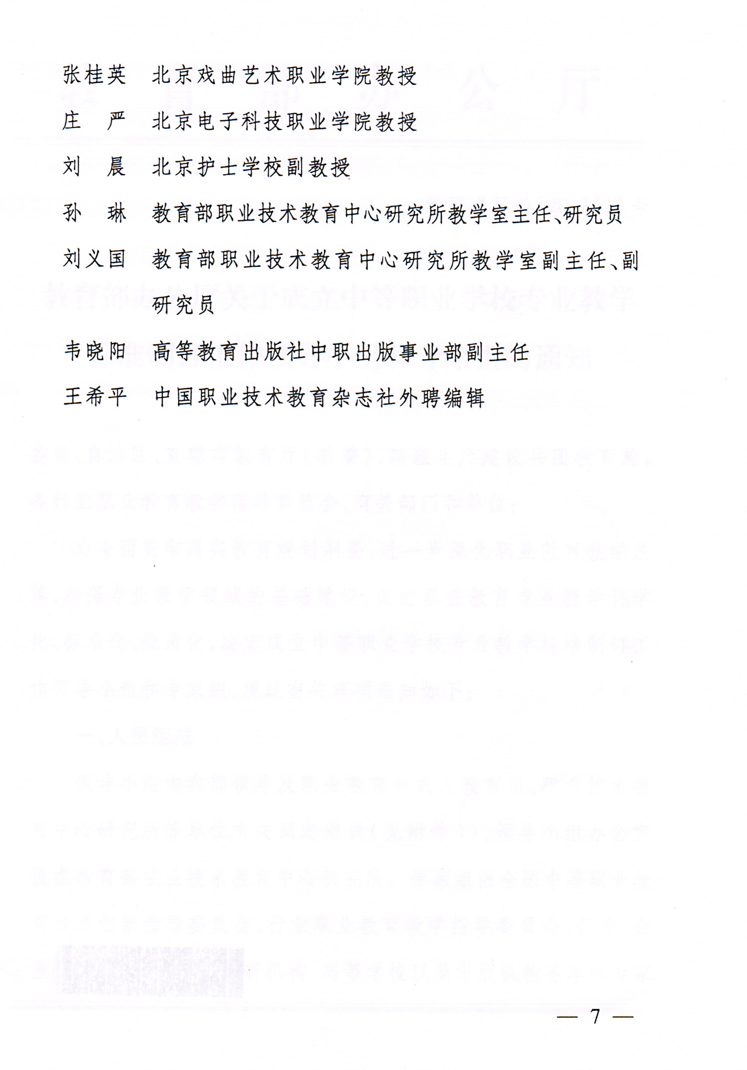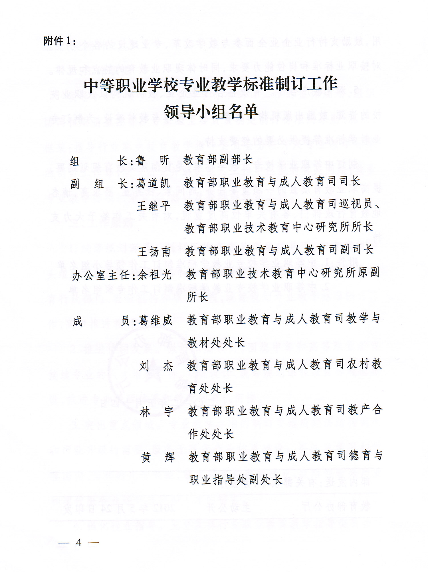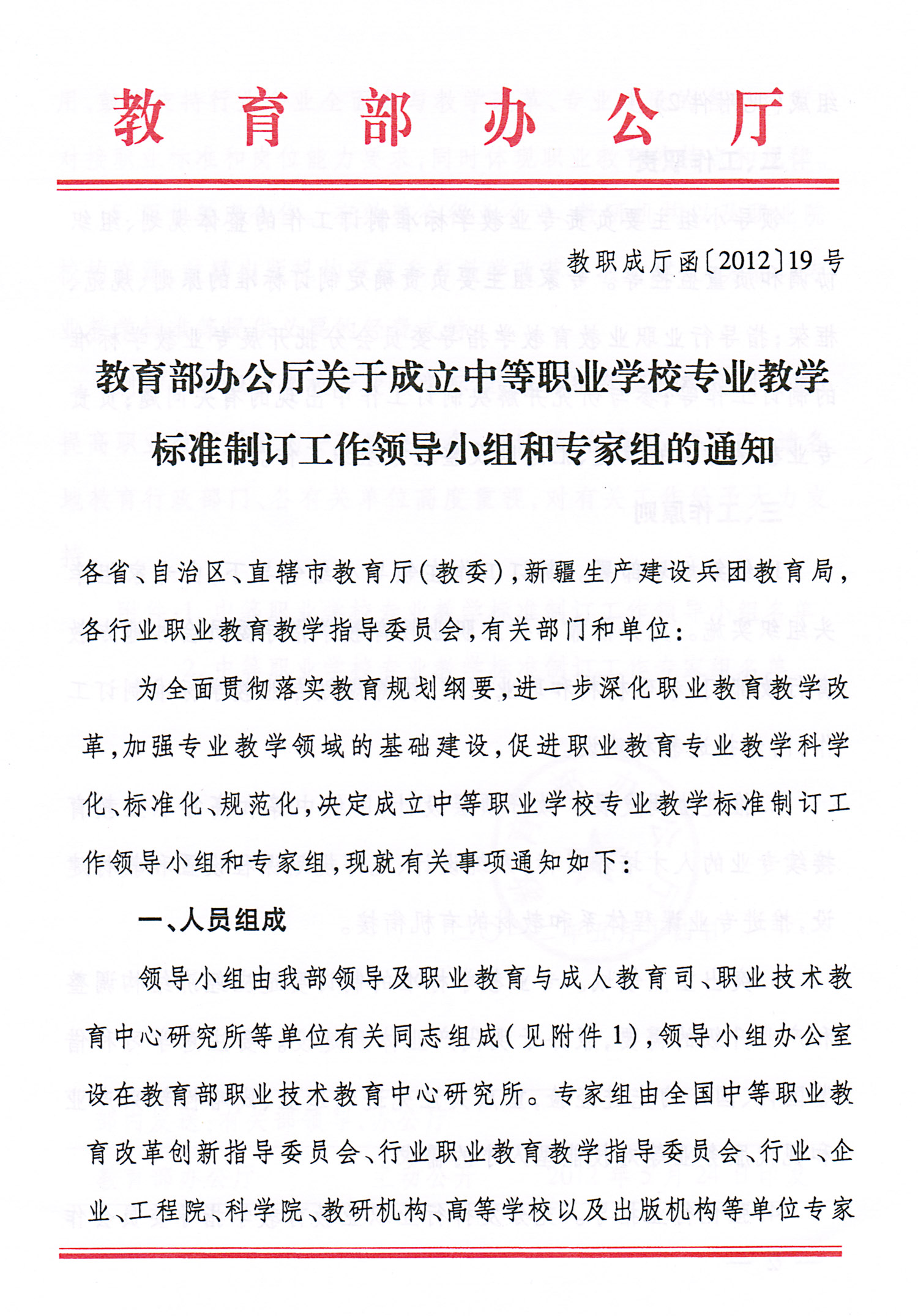 教育部办公厅关于成立中等职业学校专业教学制订工作领导小组和专家组的通知