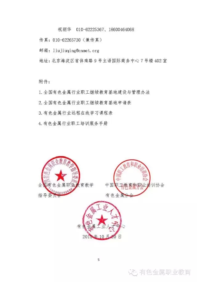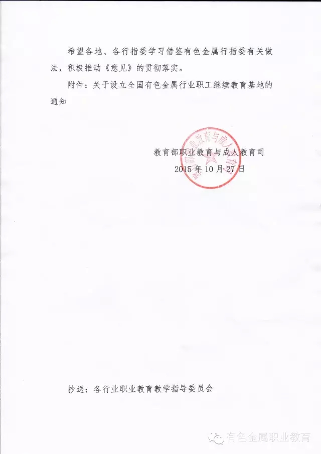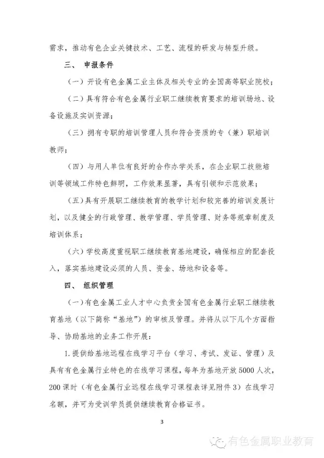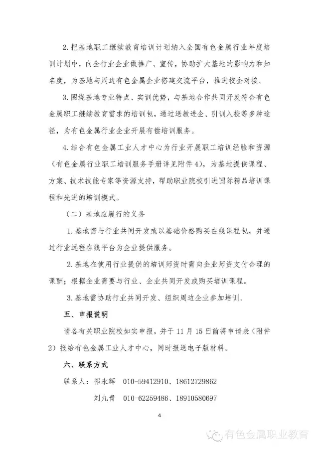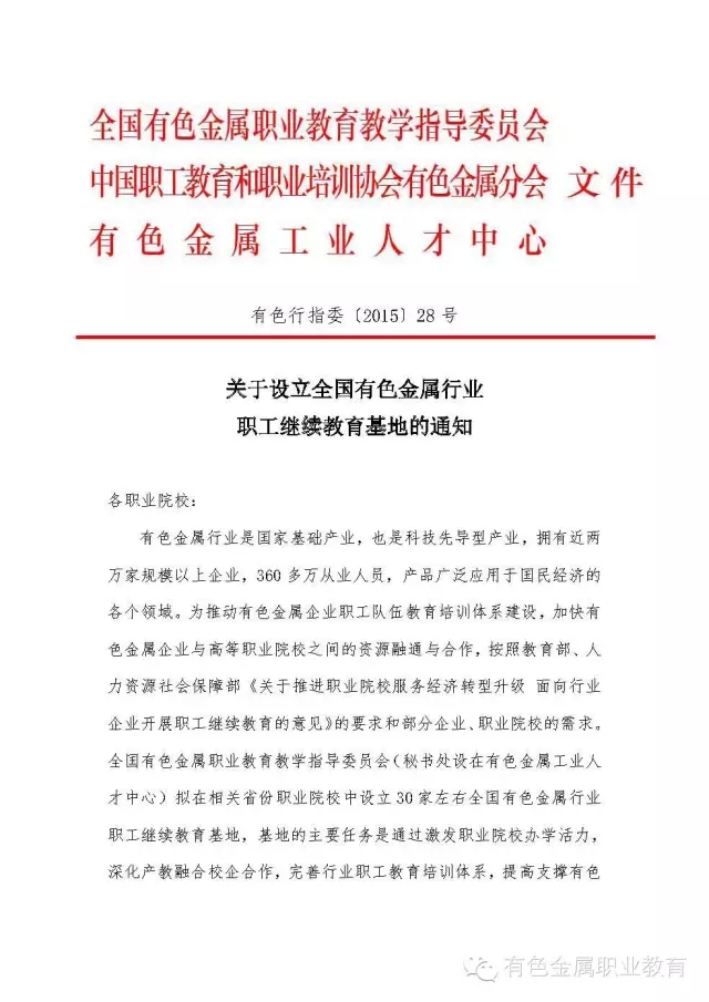 为贯彻落实教育部、人力资源社会保障部《关于推进职业院校服务经济转型升级面向行业企业开展职工继续教育的意见》(教职成[2015]3号),进一步发挥行业指导作用,激发职业院校参与职工继续教育的活力,提高有色金属行业企业职工能力素质,全国有色金属职业教育教学指导委员会、中国职工教育和职业培训协会有色金属分会、有色金属工业人才中心等机构拟在各地职业院校中遴选设立30家左右全国有色金属行业职工继续教育培训基地。现将他们关于设立全国有色金属行业职工继续教育基地的通知转发给你们,请各地根据要求在本区域内遴选推荐2-3家职业院校,由学校直接联系全国有色金属职业教育教学指导委员会报送相关材料。