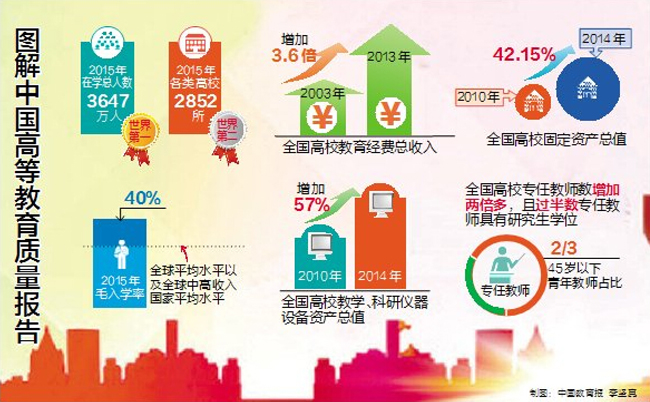 数据显示,中国高等教育“体量”世界最大,人才培养为各行各业提供了强有力的基础支撑。新世纪以来,中国高等教育实现跨越式发展,2015年在学总规模3647万人(其中普通高校本专科2625万人),位居世界第一;各类高校2852所,位居世界第二;毛入学率40%,高于全球平均水平及全球中高收入国家平均水平。高等教育发展与国民经济发展基本同步,并适度超前。2000年以来,为适应地方经济发展,中国主动调整高等教育布局结构,与区域经济社会发展步调保持协调。新建院校助推中国高等教育大转型,体现了新时期我国高等教育分类发展、分类指导的思想。按照教育规划纲要提出的创新型、复合型、应用型、技能型人才培养要求,中国高校各安其位、各显其能、特色发展,扭转了以往“千校一面”的状况。
